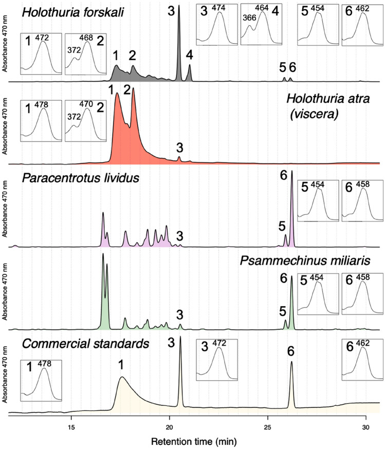 - Bandaranayake WM, Rocher AD. Role of secondary metabolites and pigments in the epidermal tissues, ripe ovaries, viscera, gut contents and diet of the sea cucumber Holothuria atra. Mar Biol. 1999;133:163–169. doi: 10.1007/s002270050455. - DOI