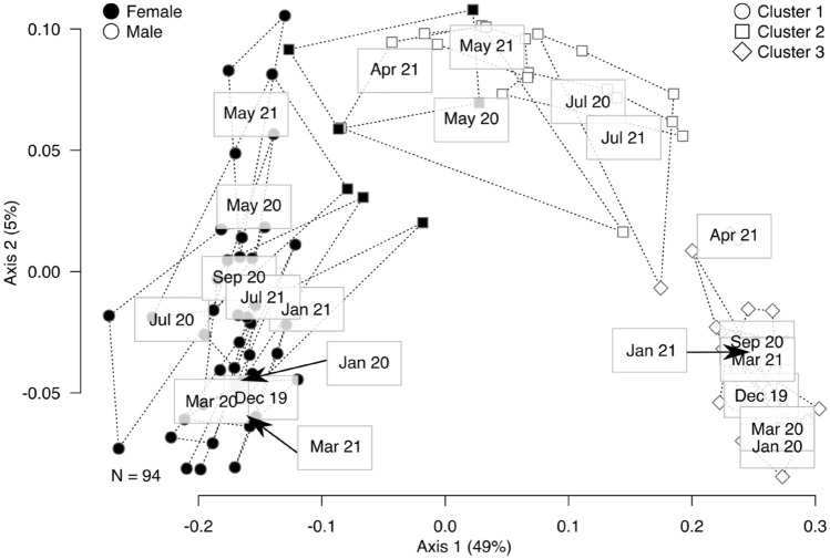 ) Holothuria forskali sampled in the Glénan Islands, France, from December 2019 to July 2021. Clusters were agglomerated according to the Ward method on a Bray–Curtis dissimilarity matrix. n = 3–5 females and 1–5 males for each sampling event