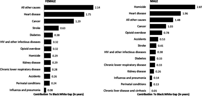 Results: Among females, the racial difference in ALE was 8.21 years; for males, it was 10.53 years. We find that cancer and heart disease mortality account for 3.03 years or 36% of the racial gap in average life expectancy among females. Differences in homicide and heart disease mortality rates comprised over 45% of the disparity among males.