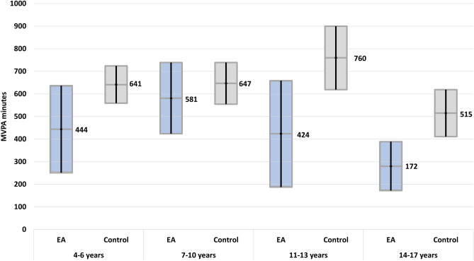 Oesophageal atresia (EA) is associated with life-long gastrointestinal and respiratory morbidity and other associated malformations. The aim of this study is to compare physical activity (PA) levels of children and adolescents with and without EA. A validated questionnaire (MoMo-PAQ) was used to evaluate PA in EA patients EA (4-17 years), who were randomly matched for gender and age (1:5) with a representative sample of the Motorik-Modul Longitudinal Study (n = 6233). Sports activity per week (sports index) and minutes of moderate to vigorous physical activity per week (MVPA minutes) were calculated. Correlations between PA and medical factors were analysed. In total, 104 patients and 520 controls were included. Children with EA were significantly less active at higher intensities (mean MPVA minutes 462; 95% confidence interval (CI): 370-554) compared to controls (626; 95% CI: 576-676), although there was no statistically significant difference in the sports index (187; 95% CI: 156-220 versus 220; 95% CI: 203-237). A lower mean weight-for-age and height-for-age, additional urogenital (r = - 0.20, p = 0.04) or anorectal malformation (r = - 0.24, p = 0.01) were associated with fewer MVPA minutes. For other medical factors (prematurity, type of repair, congenital heart disease, skeletal malformation or symptom load), no statistically significant association with PA was found. Conclusion: EA patients participated in PA at a similar level but lower intensities compared to the reference cohort. PA in EA patients was largely independent of medical factors.