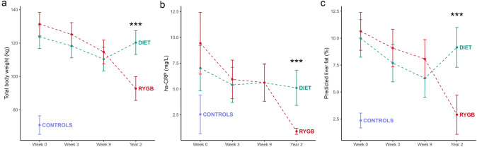 Results: A total of 80 patients were included in the RYGB group (40 patients) and diet-group (40 patients). The weight loss was similar between the groups following LED and RYGB. The LED induced a similar (mean [95% CI]) decrease in CL/F in both intervention groups (RYGB: 16% [0, 31], diet: 23% [8, 38]), but neither induced VLED resulted in any further changes in CL/F. At Year 2, CL/F had increased by 21% from baseline in the RYGB group, while it was unaltered in the diet group. Patients expressing the reduced function SLCO1B1 variants (c.521TC/CC) showed similar changes in CL/F over time compared with patients expressing the wild-type variant.