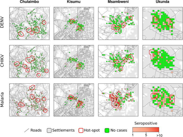 Malaria, chikungunya virus (CHIKV), and dengue virus (DENV) are endemic causes of fever among children in Kenya. The risks of infection are multifactorial and may be influenced by built and social environments. The high resolution overlapping of these diseases and factors affecting their spatial heterogeneity has not been investigated in Kenya. From 2014-2018, we prospectively followed a cohort of children from four communities in both coastal and western Kenya. Overall, 9.8% were CHIKV seropositive, 5.5% were DENV seropositive, and 39.1% were malaria positive (3521 children tested). The spatial analysis identified hot-spots for all three diseases in each site and in multiple years. The results of the model showed that the risk of exposure was linked to demographics with common factors for the three diseases including the presence of litter, crowded households, and higher wealth in these communities. These insights are of high importance to improve surveillance and targeted control of mosquito-borne diseases in Kenya.