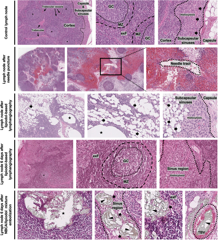 Results: By applying visual, ultrasonography, fluoroscopy, CT, cone-beam CT, and/or MRI examination or guidance, a total of eleven techniques were successfully implemented in twelve pigs. The presented techniques include inguinal postoperative lymphatic leakage (PLL) establishment, interstitial dye test, five types of lymphangiography [incl. lipiodol-based translymphatic lymphangiography (TL), lipiodol-based percutaneous intranodal lymphangiography (INL), lipiodol-based laparotomic INL, lipiodol-based interstitial lymphangiography, and interstitial magnetic resonance lymphangiography (MRL)], and four types of percutaneous interventions in the treatment of PLL [incl. thoracic duct embolization (TDE), intranodal embolization (INE), afferent lymphatic vessel sclerotherapy (ALVS), and afferent lymphatic vessel embolization (ALVE)].