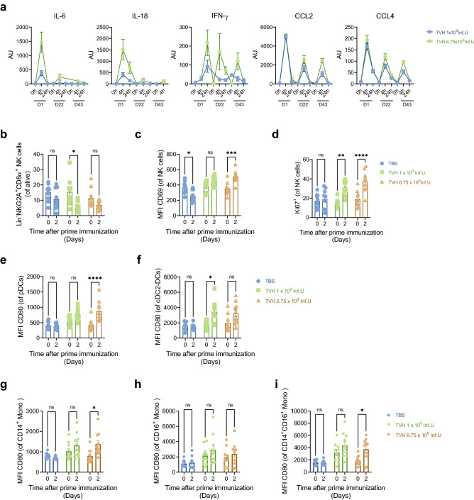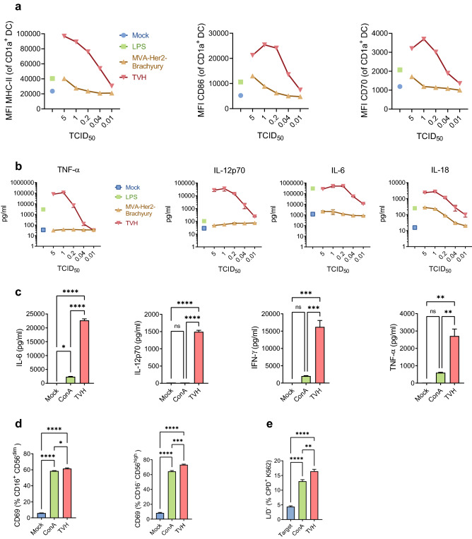 The induction of antiviral innate immunity by systemic immunization with live virus can be employed to positively impact the response to therapeutic vaccination. We previously demonstrated that systemic immunization with a non-replicating MVA encoding CD40 ligand (CD40L) enhances innate immune cell activation and function, and triggers potent antitumor CD8+ T cell responses in different murine tumor models. Antitumor efficacy was increased when combined with tumor targeting antibodies. Here we report the development of TAEK-VAC-HerBy (TVH), a first-in-class human tumor antibody enhanced killing (TAEK) vaccine based on the non-replicating MVA-BN viral vector. It encodes the membrane bound form of human CD40L, HER2 and the transcription factor Brachyury. TVH is designed for therapeutic use in HER2- or Brachyury-expressing cancer patients in combination with tumor targeting antibodies. To preclude possible oncogenic activities in infected cells and to prevent binding of vaccine-encoded HER2 by monoclonal antibodies trastuzumab and pertuzumab, genetic modifications of HER2 were introduced in the vaccine. Brachyury was genetically modified to prevent nuclear localization of the protein thereby inhibiting its transcriptional activity. CD40L encoded in TVH enhanced human leukocyte activation and cytokine secretion in vitro. Lastly, TVH intravenous administration to non-human primates was proven immunogenic and safe in a repeat-dose toxicity study. Nonclinical data presented here highlight TVH as a first-in-class immunotherapeutic vaccine platform currently under clinical investigation.