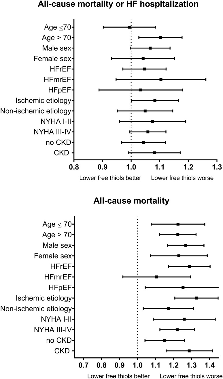 Results: Lower serum-free thiol concentrations were associated with more advanced HF, as indicated by worse NYHA class, higher plasma NT-proBNP (P < 0.001 for both) and with higher rates of all-cause mortality (hazard ratio (HR) per standard deviation (SD) decrease in free thiols: 1.253, 95% confidence interval (CI): 1.171-1.341, P < 0.001), cardiovascular mortality (HR per SD: 1.182, 95% CI: 1.086-1.288, P < 0.001), and the composite outcome (HR per SD: 1.058, 95% CI: 1.001-1.118, P = 0.046).