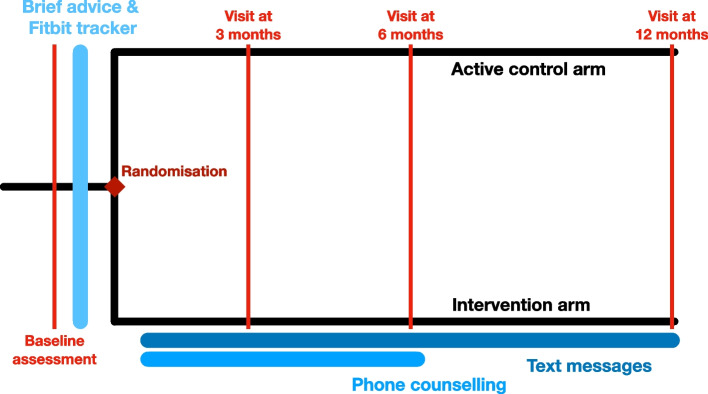 Keywords: Active control; Ecological Momentary Assessment (EMA); Fitbit; Just-in-time adaptive intervention (JITAI); Micro-randomisation; Phone counselling, Text messages; Primary care; Self-monitoring; Step-count.