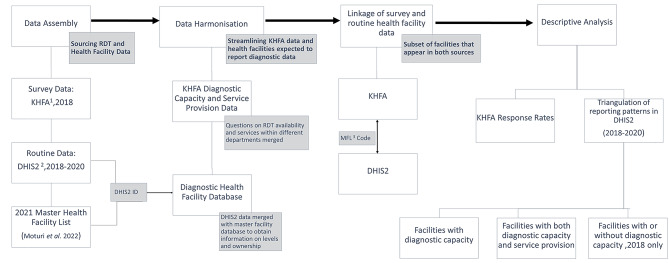 Background: Understanding the availability of rapid diagnostic tests (RDTs) is essential for attaining universal health care and reducing health inequalities. Although routine data helps measure RDT coverage and health access gaps, many healthcare facilities fail to report their monthly diagnostic test data to routine health systems, impacting routine data quality. This study sought to understand whether non-reporting by facilities is due to a lack of diagnostic and/or service provision capacity by triangulating routine and health service assessment survey data in Kenya.