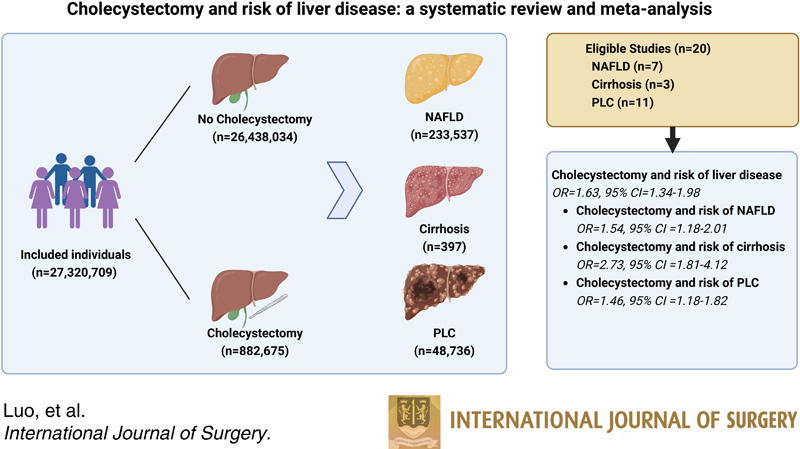 Results: We identified 20 studies with a total of 27 320 709 individuals and 282 670 liver disease cases. Cholecystectomy was associated with an increased risk of liver disease (OR: 1.63, 95% CI: 1.34-1.98). In particular, cholecystectomy was found to be significantly associated with a 54% increased risk of nonalcoholic fatty liver disease (OR: 1.54, 95% CI: 1.18-2.01), a 173% increased risk of cirrhosis (OR: 2.73, 95% CI: 1.81-4.12), and a 46% increased risk of primary liver cancer (OR: 1.46, 95% CI: 1.18-1.82).