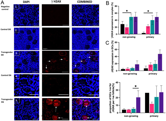 Androgens are essential in normal ovarian function and follicle health but hyperandrogenism, as seen in polycystic ovary syndrome, is associated with disordered follicle development. There are few data on the effect of long-term exposure to high levels of testosterone as found in transgender men receiving gender-affirming endocrine therapy. In this study, we investigate the effect of testosterone on the development, morphological health and DNA damage and repair capacity of human ovarian follicles in vivo and their survival in vitro. Whole ovaries were obtained from transgender men (mean age: 27.6 ± 1.7 years; range 20-34 years, n = 8) at oophorectomy taking pre-operative testosterone therapy. This was compared to cortical biopsies from age-matched healthy women obtained at caesarean section (mean age: 31.8±1.5 years; range= 25-35 years, n=8). Cortical tissues were dissected into fragments and either immediately fixed for histological analysis or cultured for 6 days and subsequently fixed. Follicle classification and morphological health were evaluated from histological sections stained with H&E and expression of γH2AX as a marker of DNA damage by IHC. In uncultured tissue, testosterone exposure was associated with reduced follicle growth activation, poor follicle health and increased DNA damage. After 6 days of culture, there was enhanced follicle activation compared to control with further deterioration in morphological health and increased DNA damage. These data indicate that high circulating concentrations of testosterone have effects on the primordial and small-growing follicles of the ovary. These results may have implications for transgender men receiving gender-affirming therapy prior to considering pregnancy or fertility preservation measures.