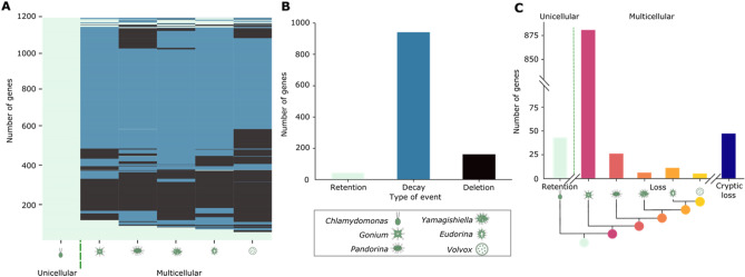 Multicellular evolution is a major transition associated with momentous diversification of multiple lineages and increased developmental complexity. The volvocine algae comprise a valuable system for the study of this transition, as they span from unicellular to undifferentiated and differentiated multicellular morphologies despite their genomes being similar, suggesting multicellular evolution requires few genetic changes to undergo dramatic shifts in developmental complexity. Here, the evolutionary dynamics of six volvocine genomes were examined, where a gradual loss of genes was observed in parallel to the co-option of a few key genes. Protein complexes in the six species exhibited novel interactions, suggesting that gene loss could play a role in evolutionary novelty. This finding was supported by gene network modeling, where gene loss outpaces gene gain in generating novel stable network states. These results suggest gene loss, in addition to gene gain and co-option, may be important for the evolution developmental complexity.