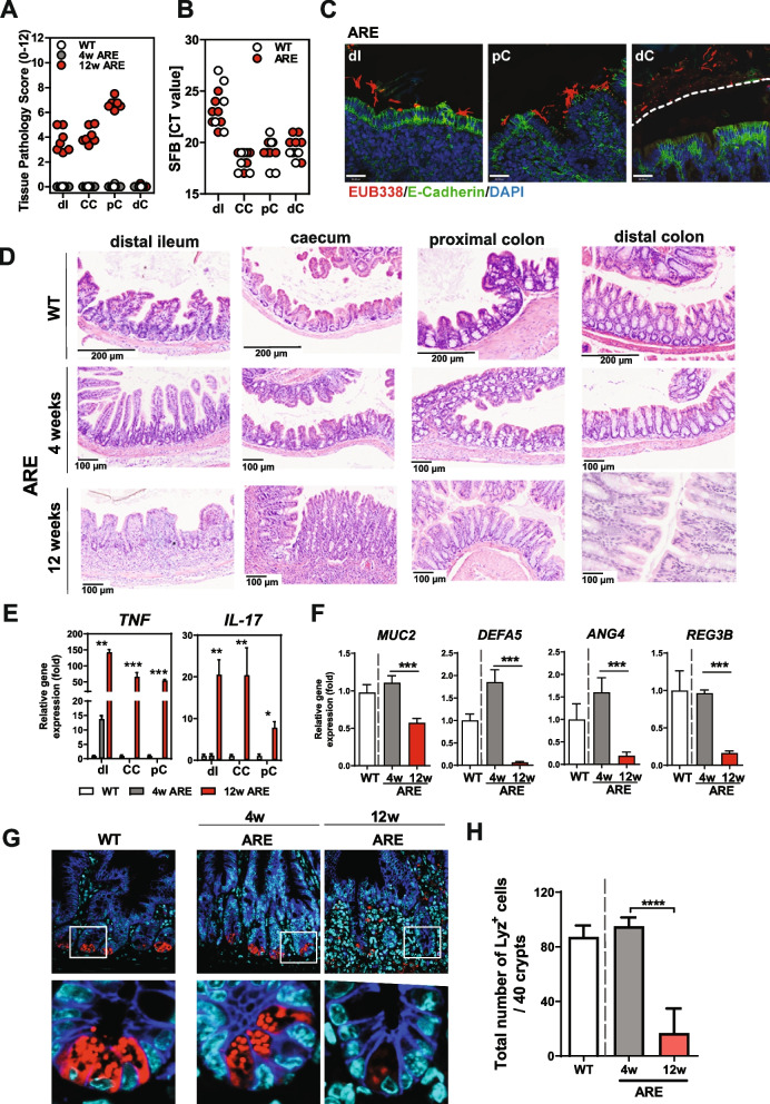 Conclusions: We identified a novel pathogenic role of SFB in driving severe CD-like ileo-colonic inflammation characterized by loss of Paneth and goblet cell functions in Tnf ΔARE mice. A purified diet antagonized SFB colonization and prevented disease development in Tnf ΔARE mice in contrast to a fiber-containing chow diet, clearly demonstrating the important role of diet in modulating a novel IBD-relevant pathobiont and supporting a direct link between diet and microbial communities in mediating protective functions. Video Abstract.