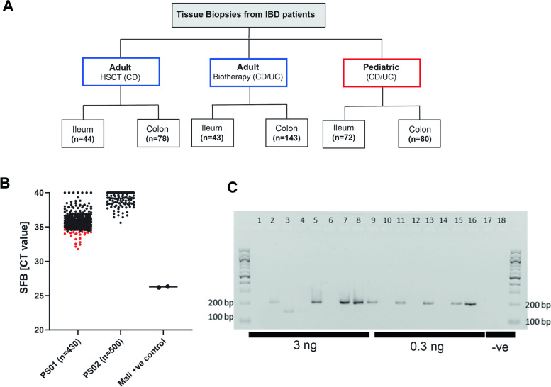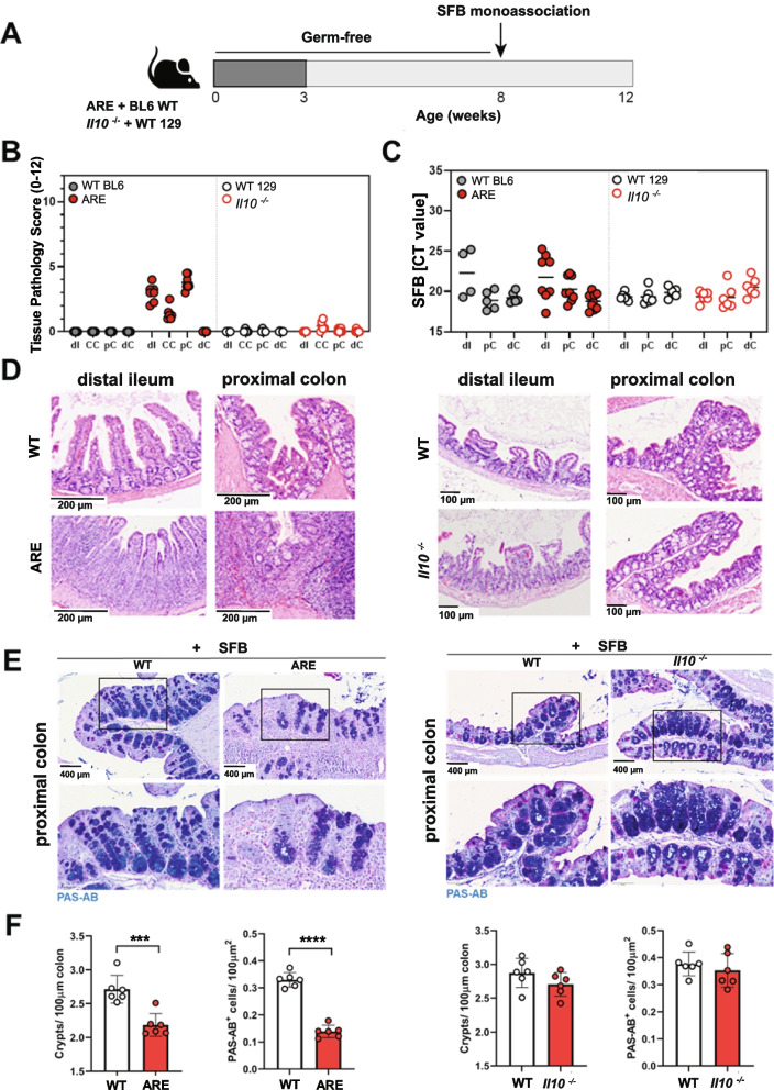 Results: We show that the abundance of SFB strongly correlates with the severity of CD-like ileal inflammation in two mouse models of ileal inflammation, including Tnf ΔARE and SAMP/Yit mice. SFB mono-colonization of germ-free Tnf ΔARE mice confirmed the causal link and resulted in severe ileo-colonic inflammation, characterized by elevated tissue levels of Tnf and Il-17A, neutrophil infiltration and loss of Paneth and goblet cell function. Co-colonization of SFB in human-microbiota associated Tnf ΔARE mice confirmed that SFB presence is indispensable for disease development. Screening of 468 ileal and colonic mucosal biopsies from adult and pediatric IBD patients, using previously published and newly designed human SFB-specific primer sets, showed no presence of SFB in human tissue samples, suggesting a species-specific functionality of the pathobiont. Simulating the human relevant therapeutic effect of exclusive enteral nutrition (EEN), EEN-like purified diet antagonized SFB colonization and prevented disease development in Tnf ΔARE mice, providing functional evidence for the protective mechanism of diet in modulating microbiota-dependent inflammation in IBD.