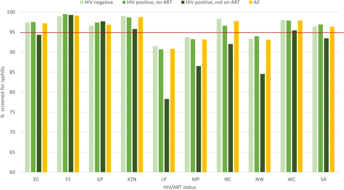 Syphilis screening coverage and positivity by HIV treatment status among South African pregnant women enrolled in the 2019 antenatal HIV sentinel survey