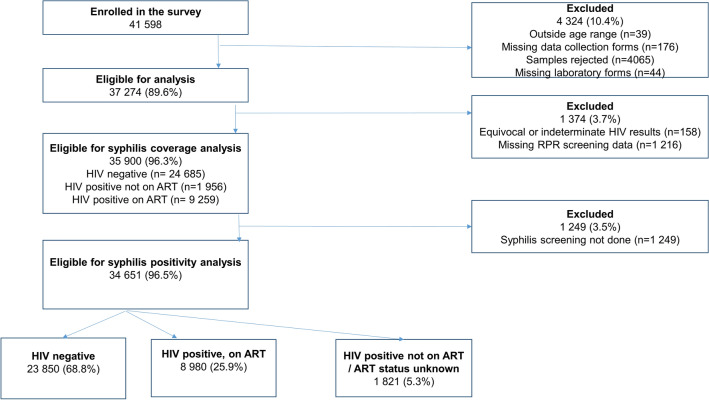 We describe coverage of maternal syphilis screening, syphilis positivity, coverage of treatment and their association with maternal HIV infection and antiretroviral treatment (ART) status among pregnant women attending South African antenatal clinics. The 2019 antenatal care sentinel survey was a cross-sectional survey conducted from 1 October to 15 November 2019 at 1589 sentinel sites in all nine provinces of the country and aimed to enrol 36,000 pregnant women ages 15-49 years regardless of HIV, ART or syphilis status. Data collection procedures included obtaining written informed consent, a brief interview, medical record review and blood specimen collection. Completed data collection forms and specimens were sent to designated regional laboratories for data capture and HIV serology testing. Data analysis determined four outcomes i) syphilis screening coverage ii) syphilis positivity iii) coverage of any treatment and iv) with Benzathine penicillin G (BPG). Multivariable logistic regression models with or without interaction between HIV infection and ART status with province were used to determine factors associated with syphilis positivity. Of the 41 598 women enrolled, 35 900 were included in the analysis for syphilis screening coverage. The weighted syphilis screening coverage was 96.4% [95% Confidence Interval (CI) 95.9-96.7%] nationally and was lowest among HIV positive women not on ART at 93.5% (95% CI 92.2-94.5%). Syphilis positivity was 2.6% (95% CI 2.4-2.9%) nationally. Among those who were syphilis positive, 91.9% (95% CI 89.8-93.7%) had documentation of syphilis treatment status, of whom 92.0% (95% CI 89.8-93.9%) were treated, with the majority treated with one or more doses of BPG [92.2% (95% CI 89.8-94.3%)]. HIV-positive women, not on ART [adjusted odd ratio (aOR) 2.24 (95% 1.71-2.93)] and those on ART [aOR 2.25 (95% CI 1.91-2.64)] were more likely to be syphilis positive compared to those who were HIV negative. The national syphilis screening coverage met the global screening target of 95%. Syphilis positivity was higher among HIV positive women compared to negative women. Introduction of rapid syphilis testing and ensuring a universal supply of appropriate treatment for syphilis will reduce the likelihood of mother-to-child transmission of syphilis.