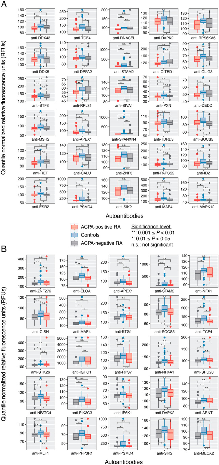 Patients with rheumatoid arthritis (RA) can test either positive or negative for circulating anti-citrullinated protein antibodies (ACPA) and are thereby categorized as ACPA-positive (ACPA+) or ACPA-negative (ACPA-), respectively. In this study, we aimed to elucidate a broader range of serological autoantibodies that could further explain immunological differences between patients with ACPA+ RA and ACPA- RA. On serum collected from adult patients with ACPA+ RA (n = 32), ACPA- RA (n = 30), and matched healthy controls (n = 30), we used a highly multiplex autoantibody profiling assay to screen for over 1600 IgG autoantibodies that target full-length, correctly folded, native human proteins. We identified differences in serum autoantibodies between patients with ACPA+ RA and ACPA- RA compared with healthy controls. Specifically, we found 22 and 19 autoantibodies with significantly higher abundances in ACPA+ RA patients and ACPA- RA patients, respectively. Among these two sets of autoantibodies, only one autoantibody (anti-GTF2A2) was common in both comparisons; this provides further evidence of immunological differences between these two RA subgroups despite sharing similar symptoms. On the other hand, we identified 30 and 25 autoantibodies with lower abundances in ACPA+ RA and ACPA- RA, respectively, of which 8 autoantibodies were common in both comparisons; we report for the first time that the depletion of certain autoantibodies may be linked to this autoimmune disease. Functional enrichment analysis of the protein antigens targeted by these autoantibodies showed an over-representation of a range of essential biological processes, including programmed cell death, metabolism, and signal transduction. Lastly, we found that autoantibodies correlate with Clinical Disease Activity Index, but associate differently depending on patients' ACPA status. In all, we present candidate autoantibody biomarker signatures associated with ACPA status and disease activity in RA, providing a promising avenue for patient stratification and diagnostics.