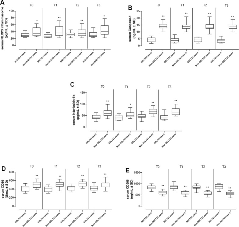 Methods: In a multi-center study, we evaluated 369 T2DM patients with Mv-NOCS divided in 258 (69.9%) patients that did not receive the SGLT2-I therapy (Non-SGLT2-I users), and 111 (30.1%) patients that were treated with SGLT2-I therapy (SGLT2-I users) after percutaneous coronary intervention (PCI) and optical coherence tomography (OCT) evaluation. As the primary study endpoint, we evaluated the effects of SGLT2-I on FCT changes at 1 year of follow-up. As secondary endpoints, we evaluated at baseline and at 12 months follow-up the inflammatory systemic and plaque burden and rate of MACEs, and predictors of MACE through multivariable analysis.