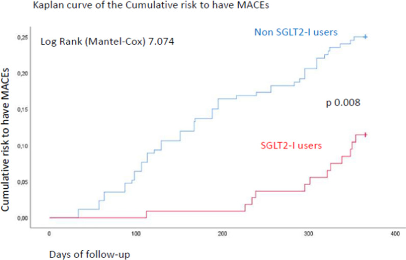 Results: At 6 and 12 months of follow-up, SGLT2-I users vs. Non-SGLT2-I users showed lower body mass index (BMI), glycemia, glycated hemoglobin, B-type natriuretic peptide, and inflammatory cells/molecules values (p < 0.05). SGLT2-I users vs. Non-SGLT2-I users, as evaluated by OCT, evidenced the highest values of minimum FCT, and lowest values of lipid arc degree and macrophage grade (p < 0.05). At the follow-up end, SGLT2-I users vs. Non-SGLT2-I users had a lower rate of MACEs [n 12 (10.8%) vs. n 57 (22.1%); p < 0.05]. Finally, Hb1Ac values (1.930, [CI 95%: 1.149-2.176]), macrophage grade (1.188, [CI 95%: 1.073-1.315]), and SGLT2-I therapy (0.342, [CI 95%: 0.180-0.651]) were independent predictors of MACEs at 1 year of follow-up.
