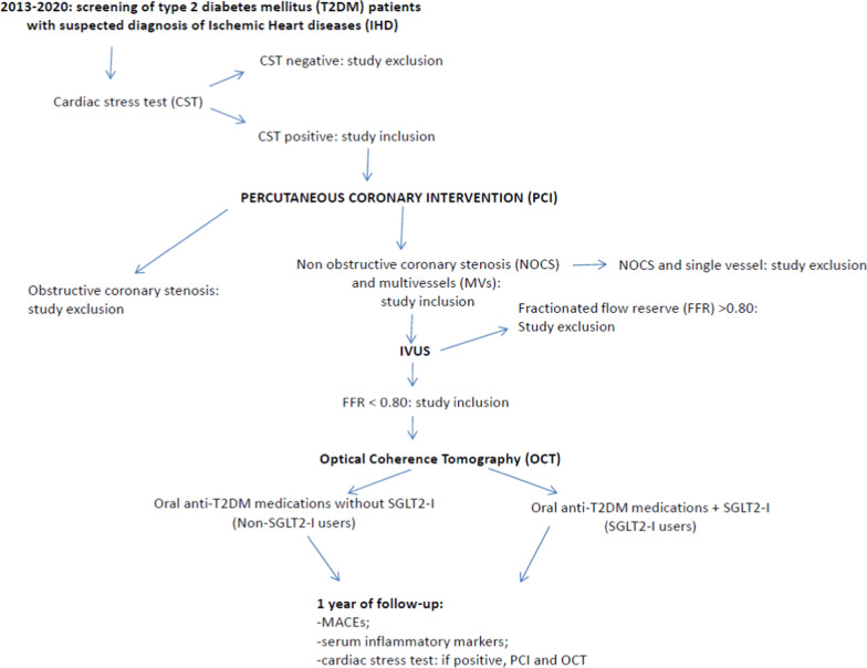 Conclusions: SGLT2-I therapy may reduce about 65% the risk to have MACEs at 1 year of follow-up, via ameliorative effects on glucose homeostasis, and by the reduction of systemic inflammatory burden, and local effects on the atherosclerotic plaque inflammation, lipids' deposit, and FCT in Mv-NOCS patients with T2DM.