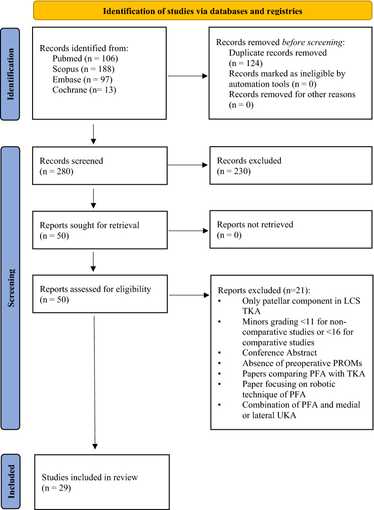 Methods: A systematic literature search following PRISMA guidelines was conducted on PubMed, Scopus, Embase and Cochrane databases, to identify possible relevant studies, published from the inception of these databases until 11.11.2022. Randomized control trials (RCTs), case series, case control studies and cohort studies, written in English or German, and published in peer-reviewed journals after 2010, were included. Not original studies, case reports, simulation studies, systematic reviews, or studies that included patients who underwent TKA or unicompartmental arthroplasty (UKA) of the medial or lateral compartment of the knee, were excluded. Additionally, only articles that assessed functional and/or clinical outcomes, patient-reported outcomes (PROMs), radiographic progression of OA, complication rates, implant survival rates, pain, as well as conversion to TKA rates in patients treated with PFA, using inlay or onlay trochlea designs, were included. For quality assessment, the Methodological Index for Non-Randomized Studies (MINORS) for non-comparative and comparative clinical intervention studies was used.