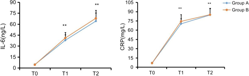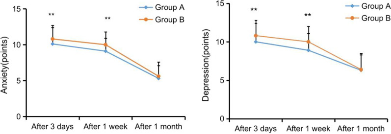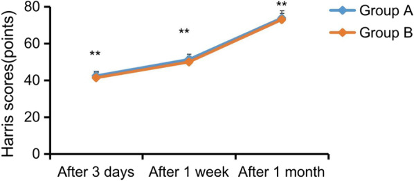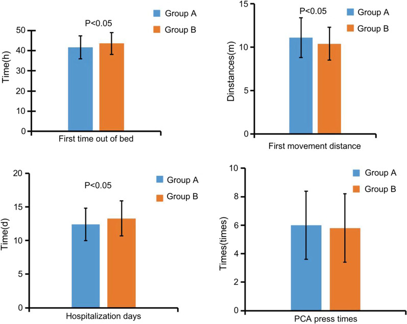 Results: There was no significant difference in VAS score and PCA compression times (P > 0.05), but the incidence of nausea, vomiting and dizziness in group B was higher than that in group A (P < 0.05). Compared with group B, the levels of IL-6 and CRP in group A at 24 h and 72 h after operation were significantly decreased (P < 0.05). Postoperative ambulation time and ambulation distance in group A were better than those in group B (P < 0.05). The HAD score of group A was lower than that of group B at 3 days and 1 week after operation (P < 0.05). However, there was no significant difference between the two groups at 1 month after operation (P > 0.05). The Harris score of group A was higher than that of group B at 3 days, 1 week and 1 month after operation (P < 0.05).