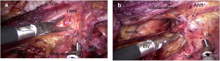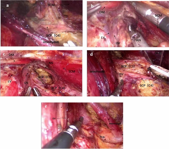 Methods: Wu's seven steps for endoscopic central and lateral neck dissection via breast combined with oral approach for papillary thyroid cancer are: (1) establish the working space, (2) isolate the sternocleidomastoid and internal jugular vein, (3) dissect the thyroid via breast approach, (4) dissect the central lymph nodes via oral approach, (5) dissect the inferior board of level IV via oral approach, (6) remove the tissues of levels IV, III, and II via breast approach, and (7) wash the working space and place drainage tubes. Twelve patients were assigned to the Wu's seven steps group, and 13 patients were assigned to the contrast group. The operative procedure of the contrast group was the same as Wu's seven steps except for a few key differences, such as that the central lymph nodes were dissected via breast approach first and the internal jugular vein(IJV) was dissected from the cricoid cartilage down to the venous angle.