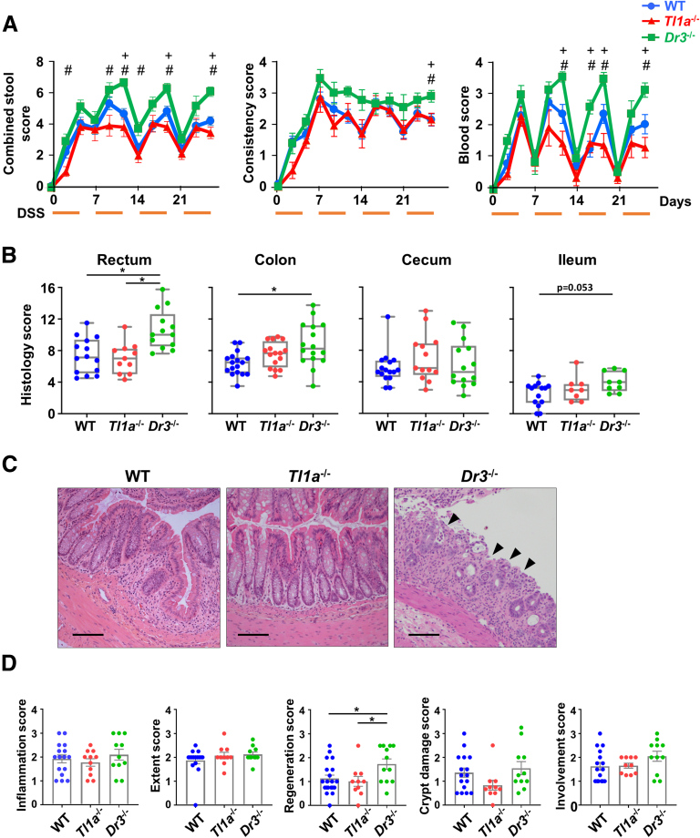 Conclusions: Our findings establish a novel function of DR3 in IEC homeostasis and postinjury regeneration independent of its established role in innate lymphoid cells and T-helper cells.