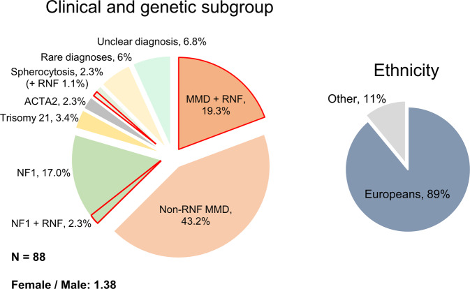 Pediatric Moyamoya Angiopathy (MMA) is a progressive intracranial occlusive arteriopathy that represents a leading cause of transient ischemic attacks and strokes in childhood. Despite this, up to now no large, exclusively pediatric MMA cohort has been subjected to systematic genetic investigation. In this study, we performed molecular karyotyping, exome sequencing and automated structural assessment of missense variants on a series of 88 pediatric MMA patients and correlated genetic, angiographic and clinical (stroke burden) findings. The two largest subgroups in our cohort consisted of RNF213 and neurofibromatosis type 1 (NF1) patients. While deleterious RNF213 variants were associated with a severe MMA clinical course with early symptom onset, frequent posterior cerebral artery involvement and higher stroke rates in multiple territories, NF1 patients had a similar infarct burden compared to non-NF1 individuals and were often diagnosed incidentally during routine MRIs. Additionally, we found that MMA-associated RNF213 variants have lower predicted functional impact compared to those associated with aortic disease. We also raise the question of MMA as a feature of recurrent as well as rare chromosomal imbalances and further support the possible association of MMA with STAT3 deficiency. In conclusion, we provide a comprehensive characterization at the genetic and clinical level of a large exclusively pediatric MMA population. Due to the clinical differences found across genetic subgroups, we propose genetic testing for risk stratification as part of the routine assessment of pediatric MMA patients.
