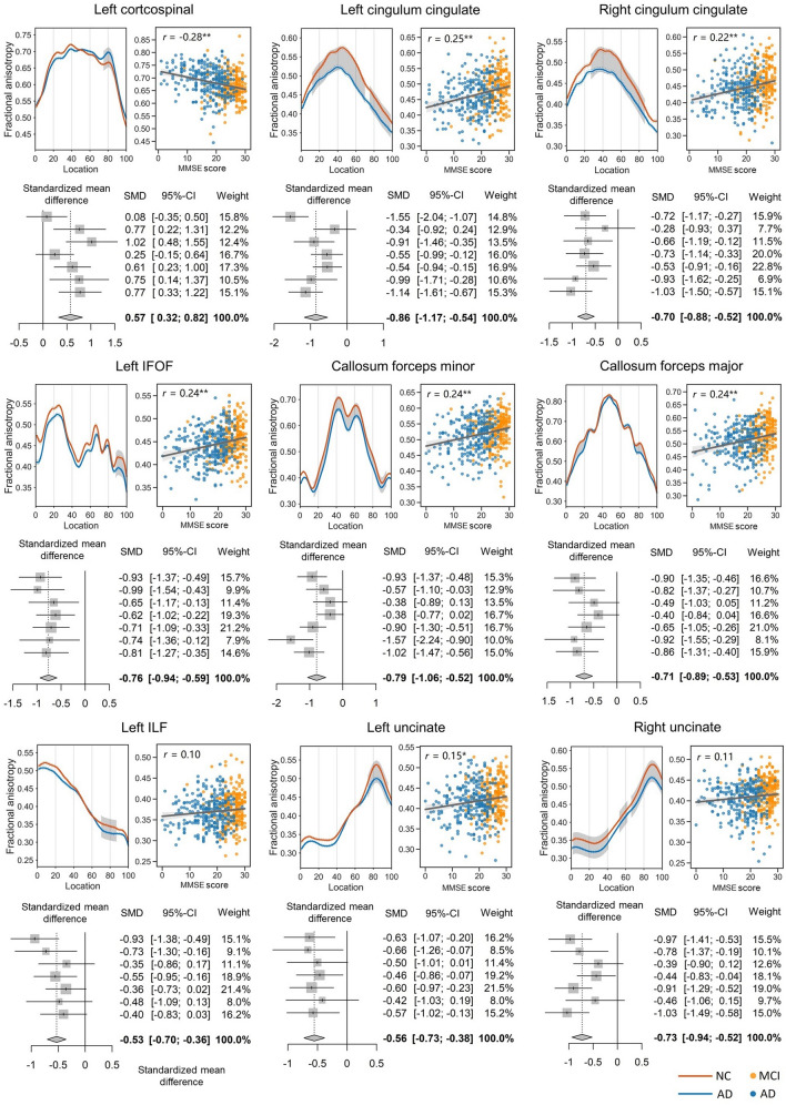 Alzheimer's disease (AD) is associated with the impairment of white matter (WM) tracts. The current study aimed to verify the utility of WM as the neuroimaging marker of AD with multisite diffusion tensor imaging datasets [321 patients with AD, 265 patients with mild cognitive impairment (MCI), 279 normal controls (NC)], a unified pipeline, and independent site cross-validation. Automated fiber quantification was used to extract diffusion profiles along tracts. Random-effects meta-analyses showed a reproducible degeneration pattern in which fractional anisotropy significantly decreased in the AD and MCI groups compared with NC. Machine learning models using tract-based features showed good generalizability among independent site cross-validation. The diffusion metrics of the altered regions and the AD probability predicted by the models were highly correlated with cognitive ability in the AD and MCI groups. We highlighted the reproducibility and generalizability of the degeneration pattern of WM tracts in AD.