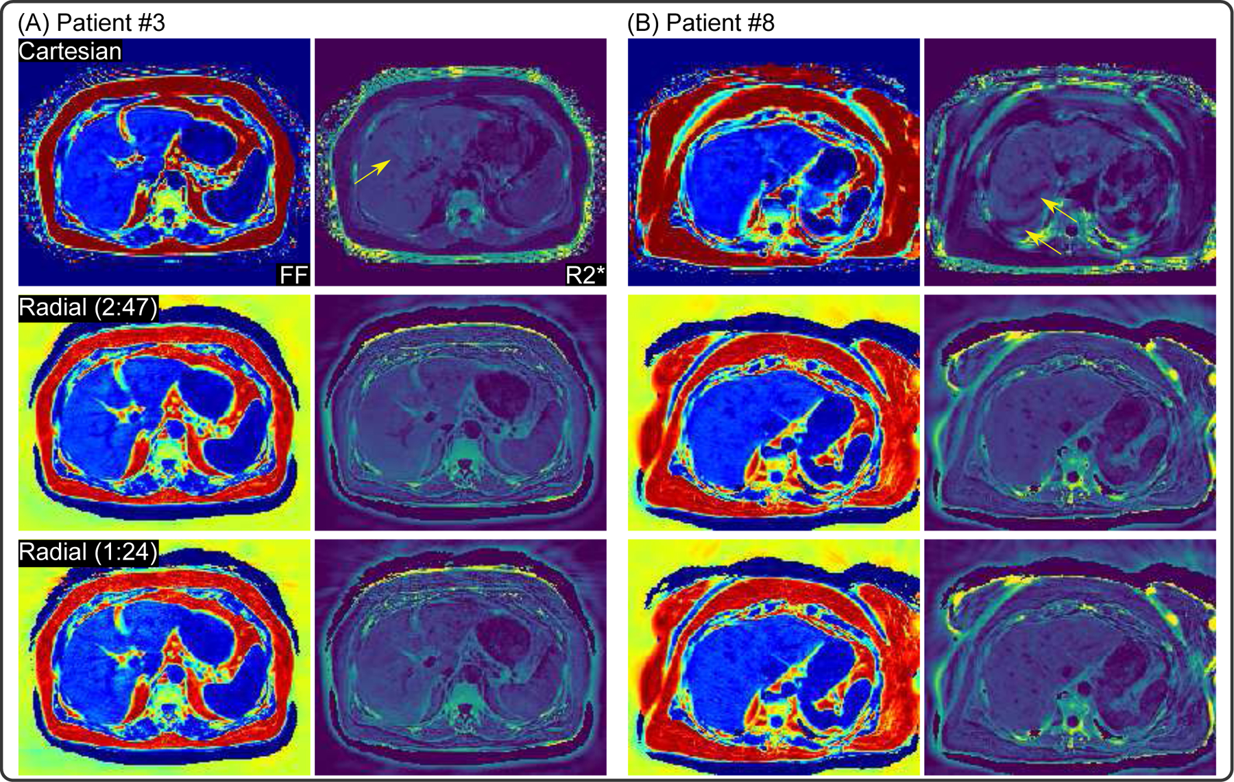 This work introduced a stack-of-radial multi-echo asymmetric-echo MRI sequence for free-breathing liver volumetric acquisition. Regularized model-based reconstruction was implemented in Berkeley Advanced Reconstruction Toolbox (BART) to jointly estimate all physical parameter maps (water, fat, R2∗ , and B0 field inhomogeneity maps) and coil sensitivity maps from self-gated k -space data. Specifically, locally low rank and temporal total variation regularization were employed directly on physical parameter maps. The proposed free-breathing radial technique was tested on a water/fat & iron phantom, a young volunteer, and obesity/diabetes/hepatic steatosis patients. Quantitative fat fraction and R2∗ accuracy were confirmed by comparing our technique with the reference breath-hold Cartesian scan. The multi-echo radial sampling sequence achieves fast k -space coverage and is robust to motion. Moreover, the proposed motion-resolved model-based reconstruction allows for free-breathing liver fat and R2∗ quantification in multiple motion states. Overall, our proposed technique offers a convenient tool for non-invasive liver assessment with no breath holding requirement.