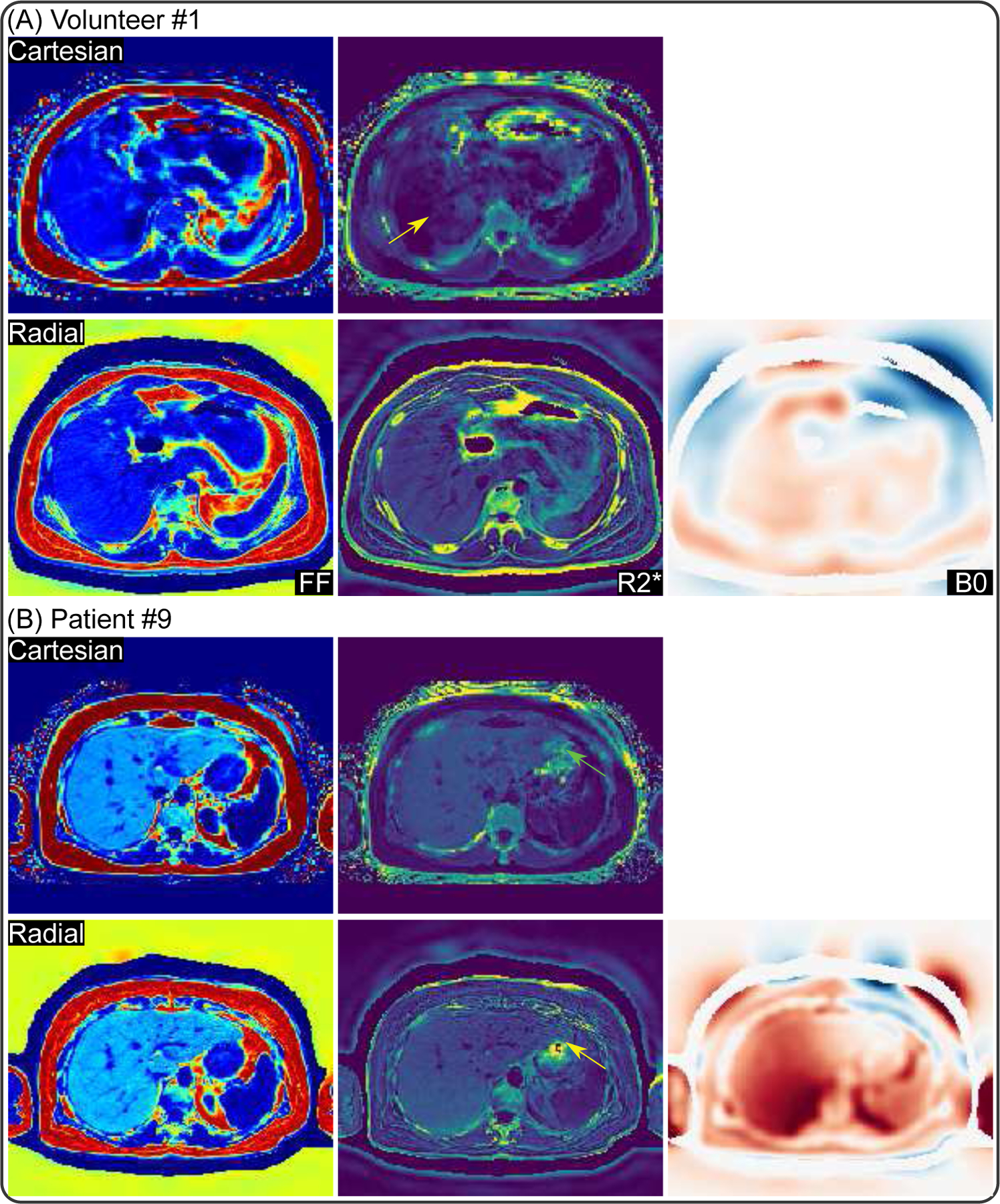 Free-Breathing Liver Fat, R₂* and B₀ Field Mapping Using Multi-Echo Radial FLASH and Regularized Model-Based Reconstruction