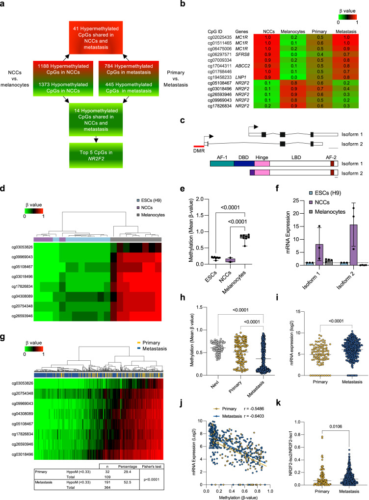 Metastatic melanoma develops once transformed melanocytic cells begin to de-differentiate into migratory and invasive melanoma cells with neural crest cell (NCC)-like and epithelial-to-mesenchymal transition (EMT)-like features. However, it is still unclear how transformed melanocytes assume a metastatic melanoma cell state. Here, we define DNA methylation changes that accompany metastatic progression in melanoma patients and discover Nuclear Receptor Subfamily 2 Group F, Member 2 - isoform 2 (NR2F2-Iso2) as an epigenetically regulated metastasis driver. NR2F2-Iso2 is transcribed from an alternative transcriptional start site (TSS) and it is truncated at the N-terminal end which encodes the NR2F2 DNA-binding domain. We find that NR2F2-Iso2 expression is turned off by DNA methylation when NCCs differentiate into melanocytes. Conversely, this process is reversed during metastatic melanoma progression, when NR2F2-Iso2 becomes increasingly hypomethylated and re-expressed. Our functional and molecular studies suggest that NR2F2-Iso2 drives metastatic melanoma progression by modulating the activity of full-length NR2F2 (Isoform 1) over EMT- and NCC-associated target genes. Our findings indicate that DNA methylation changes play a crucial role during metastatic melanoma progression, and their control of NR2F2 activity allows transformed melanocytes to acquire NCC-like and EMT-like features. This epigenetically regulated transcriptional plasticity facilitates cell state transitions and metastatic spread.