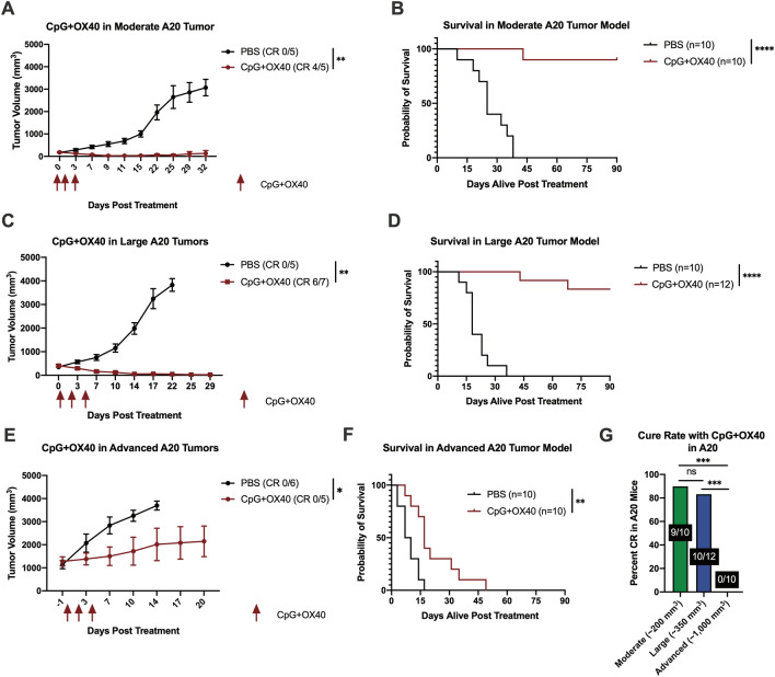 Conclusions: Increased tumor volume negatively impacts the anti-tumor capability of CpG + OX40 in-situ vaccine. The addition of checkpoint blockade augmented the efficacy of CpG + OX40 in the A20 but not B78 model. These results highlight the importance of considering multiple preclinical model conditions when assessing the efficacy of cancer immunotherapy regimens and their translation to clinical testing.
