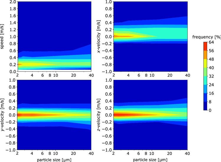 Due to its importance in airborne disease transmission, especially because of the COVID-19 pandemic, much attention has recently been devoted by the scientific community to the analysis of dispersion of particle-laden air clouds ejected by humans during different respiratory activities. In spite of that, a lack of knowledge is still present particularly with regard to the velocity of the emitted particles, which could differ considerably from that of the air phase. The velocity of the particles is also expected to vary with their size. In this work, simultaneous measurements of size and velocity of particles emitted by humans while speaking have been performed by means of Interferometric Laser Imaging Droplet Sizing (ILIDS). This technique allowed us to detect emitted particles with size down to 2 µm as well as to quantify all three components of the velocity vector and the particle concentration. The outcomes of this work may be used as boundary conditions for numerical simulations of infected respiratory cloud transmission.