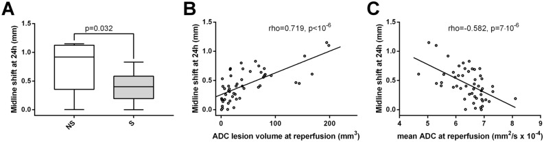 Middle cerebral artery occlusion (MCAO) models show substantial variability in outcome, introducing uncertainties in the evaluation of treatment effects. Early outcome predictors would be essential for prognostic purposes and variability control. We aimed to compare apparent diffusion coefficient (ADC) MRI data obtained during MCAO and shortly after reperfusion for their potentials in acute-phase outcome prediction. Fifty-nine male rats underwent a 45-min MCAO. Outcome was defined in three ways: 21-day survival; 24 h midline-shift and neurological scores. Animals were divided into two groups: rats surviving 21 days after MCAO (survival group, n = 46) and rats dying prematurely (non-survival/NS group, n = 13). At reperfusion, NS group showed considerably larger lesion volume and lower mean ADC of the initial lesion site (p < 0.0001), while during occlusion there were no significant group differences. At reperfusion, each survival animal showed decreased lesion volume and increased mean ADC of the initial lesion site compared to those during occlusion (p < 10-6), while NS group showed a mixed pattern. At reperfusion, lesion volume and mean ADC of the initial lesion site were significantly associated with 24 h midline-shift and neurological scores. Diffusion MRI performed soon after reperfusion has a great impact in early-phase outcome prediction, and it works better than the measurement during occlusion.