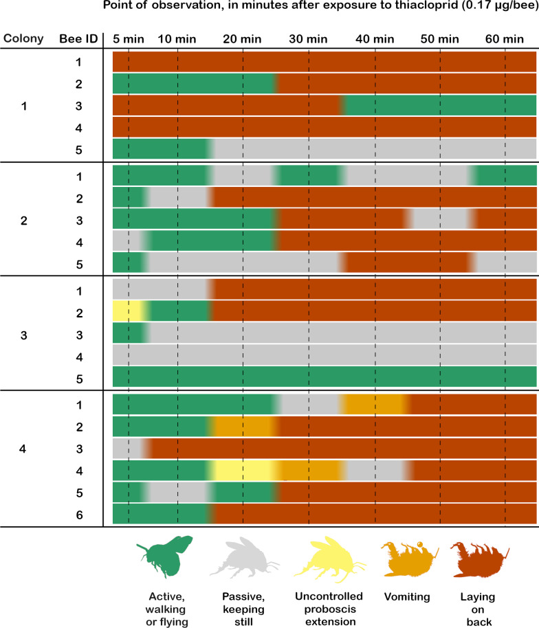 Conclusions: Our results show that oral exposure to a thiacloprid-based pesticide, calculated based on residue levels found in pollen and nectar, not only causes sublethal effects but also acute lethal effects on bumble bees. Our study underlines an urgent demand for better understanding of pesticide residues in the environment, and of the effects of those residue levels on pollinators. These findings fill the gap in the existing knowledge and help the scientific community and policymakers to enhance the sustainable use of pesticides.