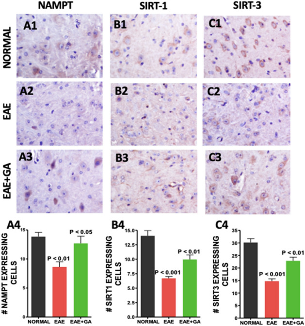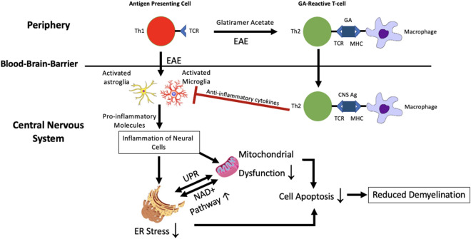 Endoplasmic reticulum (ER) stress and mitochondrial dysfunction are found in lesions of multiple sclerosis (MS) and animal models of MS such as experimental autoimmune encephalomyelitis (EAE), and may contribute to the neuronal loss that underlies permanent impairment. We investigated whether glatiramer acetate (GA) can reduce these changes in the spinal cords of chronic EAE mice by using routine histology, immunostaining, and electron microscopy. EAE spinal cord tissue exhibited increased inflammation, demyelination, mitochondrial dysfunction, ER stress, downregulation of NAD+ dependent pathways, and increased neuronal death. GA reversed these pathological changes, suggesting that immunomodulating therapy can indirectly induce neuroprotective effects in the CNS by mediating ER stress.