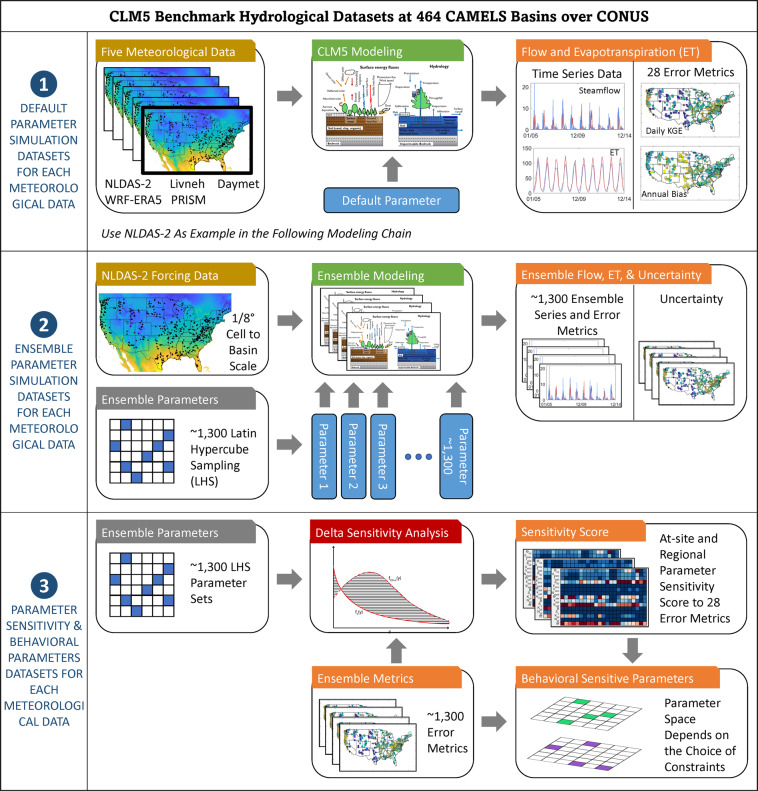 Land surface models such as the Community Land Model Version 5 (CLM5) are essential tools for simulating the behavior of the terrestrial system. Despite the extensive application of CLM5, limited attention has been paid to the underlying uncertainties associated with its hydrological parameters and how these uncertainties affect water resource applications. To address this long-standing issue, we use five meteorological datasets to conduct a comprehensive hydrological parameter uncertainty characterization of CLM5 over the hydroclimatic gradients of the conterminous United States. Key datasets produced from the uncertainty characterization experiment include: a benchmark dataset of CLM5 default hydrological performance, parameter sensitivities for 28 hydrological metrics, and large-ensemble outputs for CLM5 hydrological predictions. The presented datasets will assist CLM5 calibration and support broad applications, such as evaluating drought and flood vulnerabilities. The datasets can be used to identify the hydroclimatological conditions under which parametric uncertainties demonstrate substantial effects on hydrological predictions and clarify where further investigations are needed to understand how hydrological prediction uncertainties interact with other Earth system processes.
