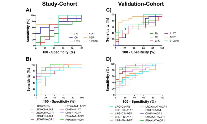Results: From 163 refined identifications, five proteins were up-regulated and two proteins were down-regulated in NM-CRC while eight proteins were up-regulated and three proteins were down-regulated in M-CRC, respectively. Altered plasma proteins in NM-CRC were mainly involved in complement activation, while those in M-CRC were clustered in acute-phase response, complement activation, and inflammatory response. Results from the study- and validation-cohorts indicate that the levels of leucine-rich alpha-2-glycoprotein-1(LRG), complement component C9 (C9), alpha-1-acid glycoprotein 1 (AGP1), and alpha-1-antitrypsin (A1AT) were statistically increased, while fibronectin (FN) level was statistically decreased in CRC patients compared to healthy controls, with most alterations found in a metastatic stage-dependent manner. ROC analysis revealed that FN exhibited the best diagnostic performance to discriminate CRC patients and healthy controls while AGP1 showed the best discrimination between the disease stages in both cohorts. The combined biomarker candidates, FN + A1AT + AGP1, exhibited perfect discriminatory power to discriminate between the CRC population and healthy controls whereas LRG + A1AT + AGP1 was likely to be the best panel to discriminate the metastatic stages in both cohorts.