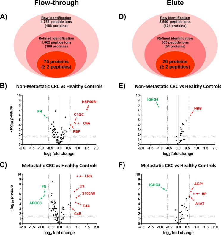 Methods: Plasma samples of patients with non-metastatic (NM) and metastatic (M) CRC and healthy controls were fractionated using MARS-14 immunoaffinity chromatography. The flow-through and elute fractions representing low- and high-abundant proteins, respectively, were analyzed by label-free quantitative proteomics mass spectrometry. The functional analysis of the proteins with greater than 1.5-fold differential expression level between the CRC and the healthy control groups were analyzed for their biological processes and molecular functions. In addition, the levels of plasma proteins showing large alterations in CRC patients were confirmed by immunoblotting using two independent cohorts. Moreover, receiver operating characteristic (ROC) curve analysis was performed for individual and combinations of biomarker candidates so as to evaluate the diagnostic performance of biomarker candidates.
