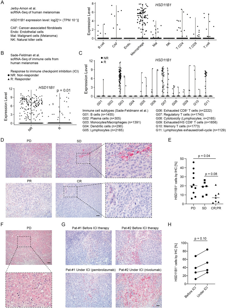 Results: Here, we identified 11-beta-hydroxysteroid dehydrogenase-1 (HSD11B1), an enzyme that converts inert glucocorticoids into active forms in tissues, as negative feedback mechanism in response to T cell immunotherapies. Glucocorticoids are potent suppressors of immune responses. HSD11B1 was expressed in different cellular compartments of melanomas, most notably myeloid cells but also T cells and melanoma cells. Enforced expression of HSD11B1 in mouse melanomas limited the efficacy of PD-1 blockade, whereas small molecule HSD11B1 inhibitors improved responses in a CD8+ T cell-dependent manner. Mechanistically, HSD11B1 inhibition in combination with PD-1 blockade augmented the production of interferon-γ by T cells. Interferon pathway activation correlated with sensitivity to PD-1 blockade linked to anti-proliferative effects on melanoma cells. Furthermore, high levels of HSD11B1, predominantly expressed by tumor-associated macrophages, were associated with poor responses to ICI therapy in two independent cohorts of patients with advanced melanomas analyzed by different methods (scRNA-seq, immunohistochemistry).