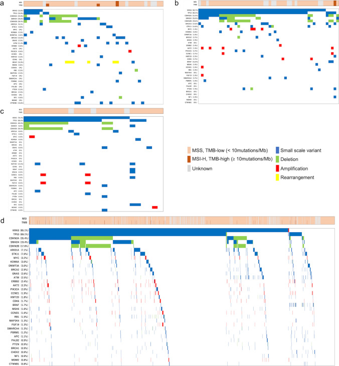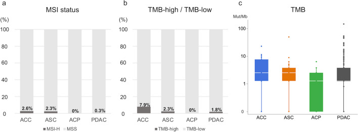 Methods: We retrospectively reviewed data on 2691 patients with unresectable pancreatic cancer: ACC, ASC, ACP, and PDAC, entered into C-CAT from June 2019 to December 2021. The clinical features, MSI/TMB status, genomic alterations, overall response rate (ORR), disease control rate (DCR), and time to treatment failure (TTF) on receiving FOLFIRINOX (FFX) or GEM + nab-PTX (GnP) therapy as first-line treatment were evaluated.