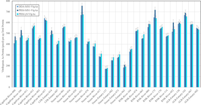 Mass spectrometry (MS) has steadily moved into the forefront of quantification-centered protein research. Protein cleavage isotope dilution MS is a proven way for quantifying proteins by using an isotope-labeled analogue of a peptide fragment of the parent protein as an internal standard. Parallel reaction monitoring (PRM) has become the go-to approach for such quantification on an Orbitrap-based instrument as it is assumed that the instrument sensitivity is enhanced. We performed a comparative study on data-dependent acquisition (DDA) and PRM-based workflows to quantify egg yolk protein precursors or vitellogenins (VTGs) Aa, Ab, and C in striped bass (Morone saxatilis). VTG proportions serve as a developmental measure of egg quality, possibly changing with the environment, and have been studied as an indicator of the health of North Carolina stocks. Based on single-factor analysis of variance comparisons of mean VTG amounts across fish from the same sample groupings, our results indicate that there is no statistical difference between MS1-based and MS2-based VTG quantification. We further conclude that DDA is able to deliver both discovery data and absolute quantification data in the same experiment.