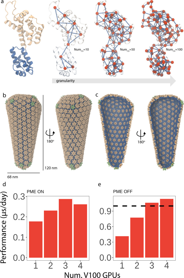 Dimensionality reduction via coarse grain modeling is a valuable tool in biomolecular research. For large assemblies, ultra coarse models are often knowledge-based, relying on a priori information to parameterize models thus hindering general predictive capability. Here, we present substantial advances to the shape based coarse graining (SBCG) method, which we refer to as SBCG2. SBCG2 utilizes a revitalized formulation of the topology representing network which makes high-granularity modeling possible, preserving atomistic details that maintain assembly characteristics. Further, we present a method of granularity selection based on charge density Fourier Shell Correlation and have additionally developed a refinement method to optimize, adjust and validate high-granularity models. We demonstrate our approach with the conical HIV-1 capsid and heteromultimeric cofilin-2 bound actin filaments. Our approach is available in the Visual Molecular Dynamics (VMD) software suite, and employs a CHARMM-compatible Hamiltonian that enables high-performance simulation in the GPU-resident NAMD3 molecular dynamics engine.