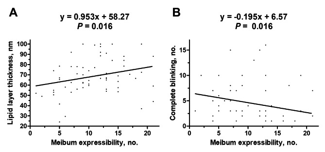 Results: There was no difference in age, Schirmer's test, lid changes, MG secretion, and MG morphology among three groups. The OSDI of asymptomatic MGD, symptomatic MGD and MGD coexisting with DED were 8.5 ± 2.9, 28.5 ± 12.8 and 27.9 ± 10.5, respectively. Patients with MGD coexisting with DED exhibited more frequent eye blinking than that of patients with asymptomatic MGD (8.1 ± 4.1 vs. 6.1 ± 3.5 blinks/20 sec, P = 0.022), and reduced LLT than that of patients with asymptomatic MGD (68.6 ± 17.2 vs. 77.6 ± 14.5 nm, P = 0.010) and symptomatic MGD (78.0 ± 17.1 nm, P = 0.015). Multivariate analysis identified LLT (per nm, OR = 0.96, 95% CI = 0.93-0.99, P = 0.002) as a significant factor associated with DED development in MGD. The number of expressible MG was positively correlated with LLT (Spearman's correlation coefficient = 0.299, P = 0.016) but negatively correlated with the number of blinking (Spearman's correlation coefficient = -0.298, P = 0.016) in MGD patients with DED, and these findings were not identified in those without DED.