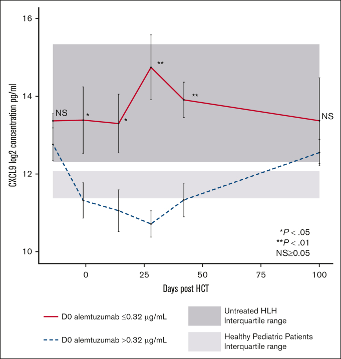 Overall survival after reduced-intensity conditioning (RIC) allogeneic hematopoietic cell transplantation (HCT) using alemtuzumab, fludarabine, and melphalan is associated with high rates of mixed chimerism (MC) and secondary graft failure (GF). We hypothesized that peritransplantation alemtuzumab levels or specific patterns of inflammation would predict these risks. We assessed samples from the Bone Marrow Transplant Clinical Trials Network 1204 (NCT01998633) to study the impact of alemtuzumab levels and cytokine patterns on MC and impending or established secondary GF (defined as donor chimerism <5% after initial engraftment and/or requirement of cellular intervention). Thirty-three patients with hemophagocytic lymphohistiocytosis (n = 25) and other IEIs (n = 8) who underwent HCTs with T-cell-replete grafts were included. Patients with day 0 alemtuzumab levels ≤0.32 μg/mL had a markedly lower incidence of MC, 14.3%, vs 90.9% in patients with levels >0.32 μg/mL (P = .008). Impending or established secondary GF was only observed in patients with day 0 alemtuzumab levels >0.32 μg/mL (P = .08). Unexpectedly, patients with impending or established secondary GF had lower CXCL9 levels. The cumulative incidence of impending or established secondary GF in patients with a day 14+ CXCL9 level ≤2394 pg/mL (day 14+ median) was 73.6% vs 0% in patients with a level >2394 pg/mL (P = .002). CXCL9 levels inversely correlated with alemtuzumab levels. These data suggest a model in which higher levels of alemtuzumab at day 0 deplete donor T cells, inhibit the graft-versus-marrow reaction (thereby suppressing CXCL9 levels), and adversely affect sustained engraftment in the nonmyeloablative HCT setting. This trial was registered at www.clinicaltrials.gov as #NCT01998633.