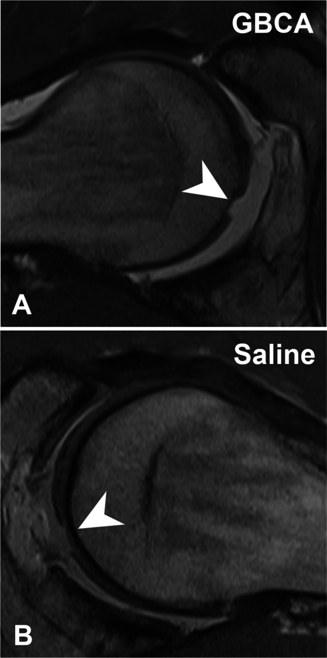 Key points: • Image quality of Saline-MRA and GBCA-MRA was excellent for labrum, acetabular and femoral cartilage, ligamentum teres, and the capsule (all p > 0.18). • The overall image contrast was lower for Saline-MRA (Saline-MRA 1.8 ± 0.5 vs. GBCA-MRA 1.1 ± 0.4; p < 0.001). • Diagnostic accuracy was high for Saline-MRA and GBCA-MRA for labrum (96% vs. 94%; p > 0.999), acetabular cartilage damage (89% vs. 86%; p = 0.902), femoral cartilage damage (97% vs. 97%; p > 0.999), and extensive cartilage damage (97% vs. 93%; p = 0.904).