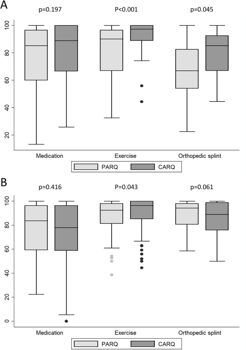 Results: Four hundred eighty-one parents and their children with JIA (n = 465) completed the PARQ and CARQ at the 4-year follow-up. Mean age and disease duration of patients were 10.1 ± 3.7 and 4.7 ± 0.8 years, respectively. The rate of missing values for PARQ/CARQ was generally satisfactory, test-retesting showed sufficient reliability. PARQ/CARQ mean child ability total scores (0-100, 100 = best) for medication were 73.1 ± 23.3/76.5 ± 24.2, for exercise: 85.6 ± 16.5/90.3 ± 15.0, for splints: 72.9 ± 24.2/82.9 ± 16.5. Construct validity was supported by PARQ and CARQ scores for medications, exercise and splints showing a fair to good correlation with the Global Adherence Assessment (GAA) and selected PedsQL scales. Adolescents showed poorer adherence than children. About one third of the parents and children reported medication errors. Perceived helpfulness was highest for medication, and adverse effects were reported the greatest barrier to treatment adherence.