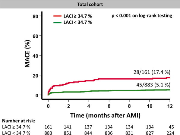 Results: LACI was significantly higher in patients with MACE compared to those without MACE (p < 0.001). Youden Index identified an optimal LACI cut-off at 34.7% to classify patients at high-risk (p < 0.001 on log-rank testing). Greater LACI was associated with MACE on univariate regression modeling (HR 8.1, 95% CI 3.4-14.9, p < 0.001) and after adjusting for baseline confounders and LV ejection fraction (LVEF) on multivariate regression analyses (HR 3.1 95% CI 1.0-9, p = 0.049). Furthermore, LACI assessment enabled further risk stratification in high-risk patients with impaired LV systolic function (LVEF ≤ 35%; p < 0.001 on log-rank testing).