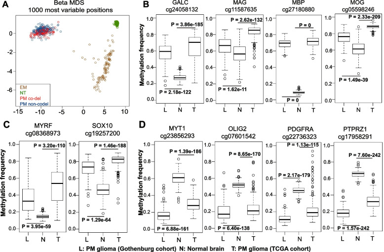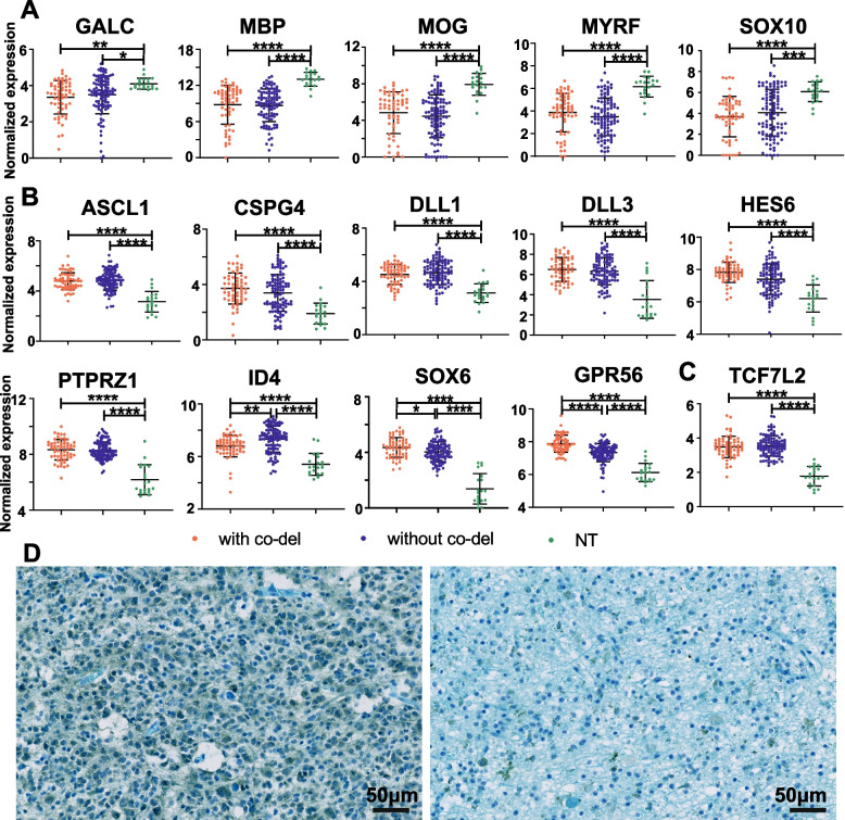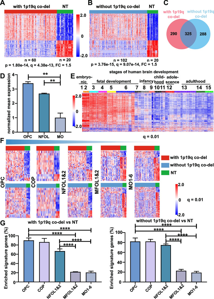 Methods: Using bulk transcriptomes and single-cell transcriptomes, we identified genes enriched in IDH-mutant gliomas with or without 1p19q co-deletion, we also assessed the expression pattern of stage-specific signatures and key regulators of oligodendrocyte lineage differentiation. We compared the expression of oligodendrocyte lineage stage-specific markers between quiescent and proliferating malignant single cells. The gene expression profiles were validated using RNAscope analysis and myelin staining and were further substantiated using data of DNA methylation and single-cell ATAC-seq. As a control, we assessed the expression pattern of astrocyte lineage markers.