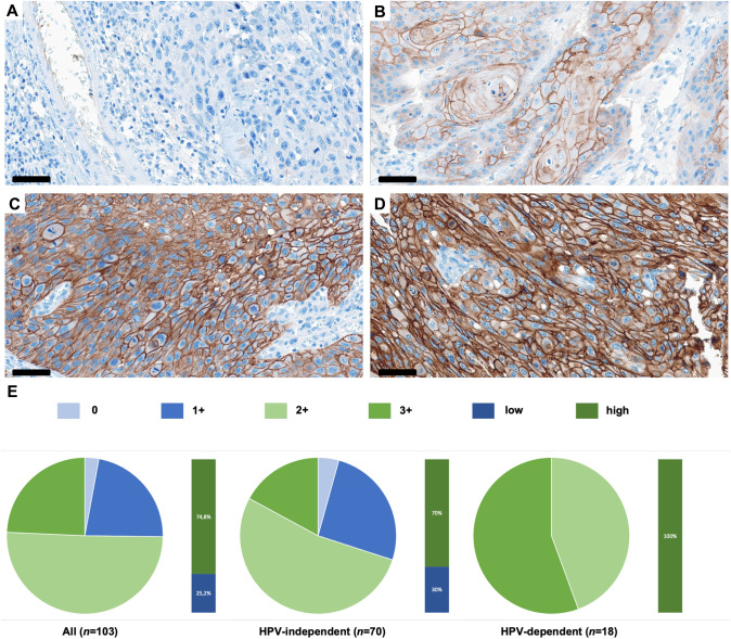 Methods: TROP-2 protein expression was investigated by immunohistochemistry in a cohort comprising n = 103 patients with primary VSCC. A four-tier scoring system (0: no staining, 1 + : low staining, 2 + : moderate staining, 3 + : high staining) was applied for quantification of protein expression. For further analyses, two groups (low TROP-2 expression: 0/1 + ; high TROP-2 expression: 2 + /3 +) were generated. The entire study cohort, as well as HPV-dependent and HPV-independent VSCC were considered separately.